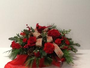 This all natural looking centrepiece has a fresh mix of winter greens, red roses and carnations, pine cones, berries and a